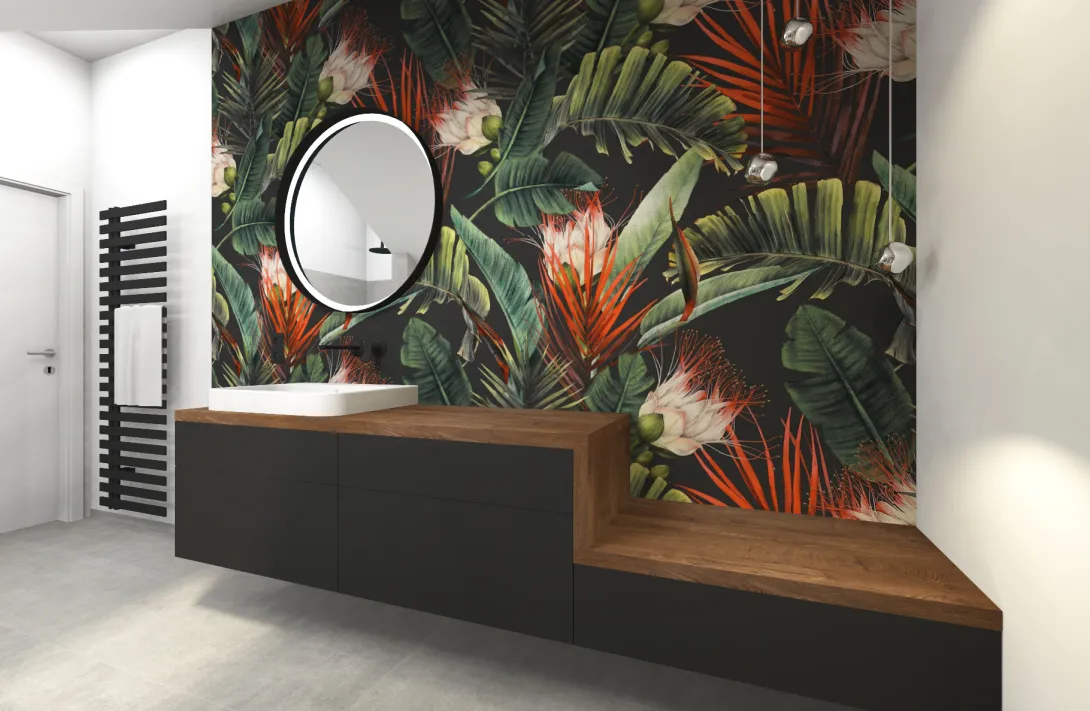 Modernes Designerbad mit freistehender Badewanne, floraler Wandgestaltung und Waschtisch mit Holzplatte.