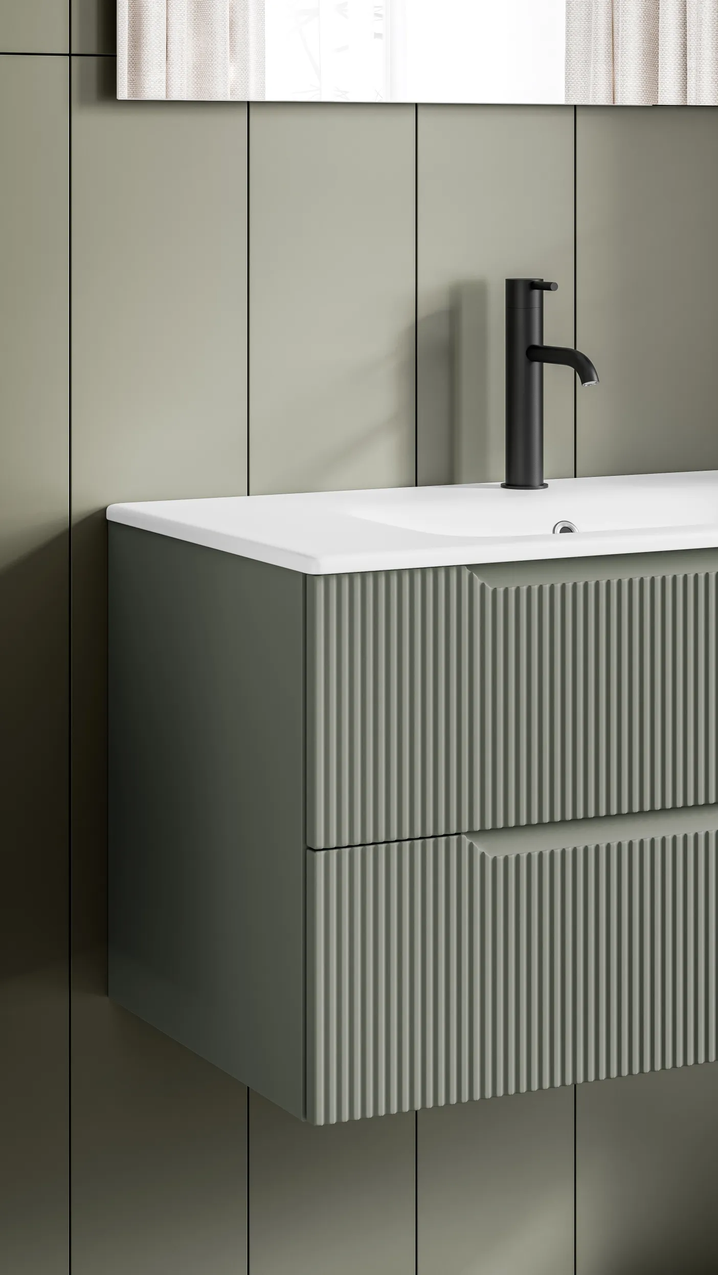 Detailansicht eines Waschtischs mit geriffelter Eichenfront und weißer Waschtischplatte.