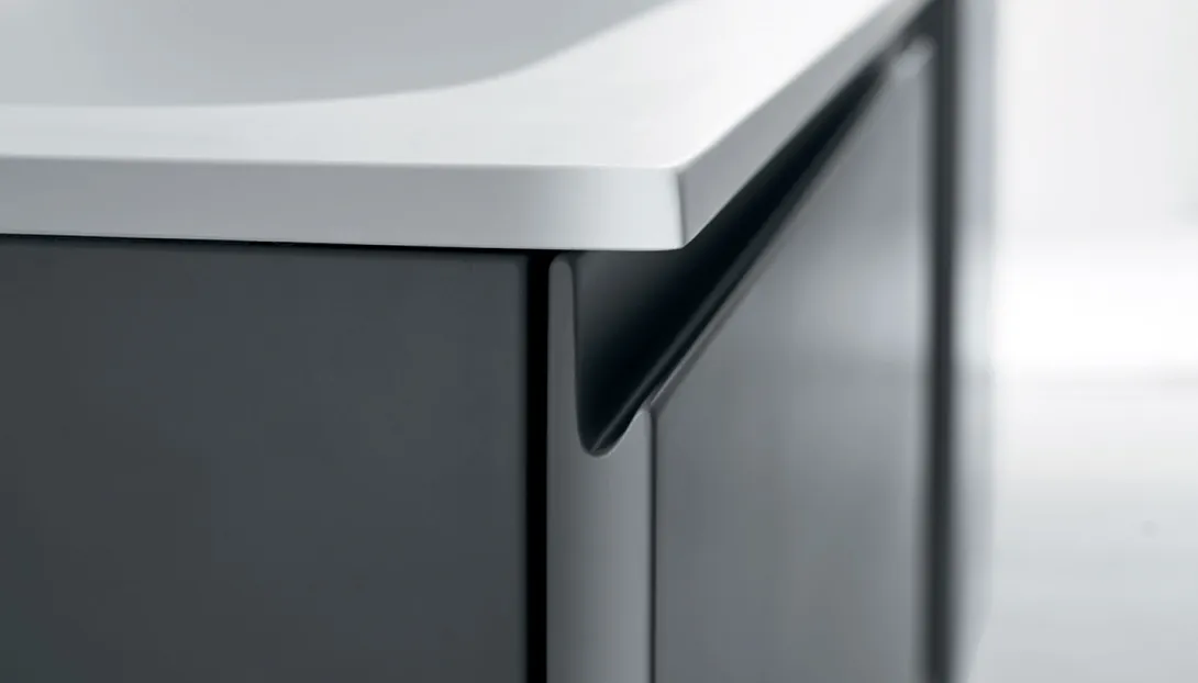 Detailansicht eines Stocco Badmöbels mit dunkler Holzfront, weißer Waschtischplatte und schwarzen Griffleisten.