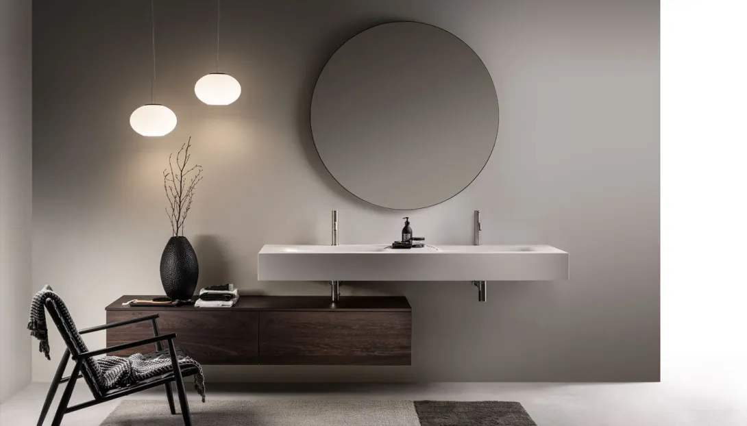 Modernes Badezimmer von Stocco mit schwebendem Waschtisch, rundem Spiegel, Aufsatzbecken und integrierter Sauna im Hintergrund.